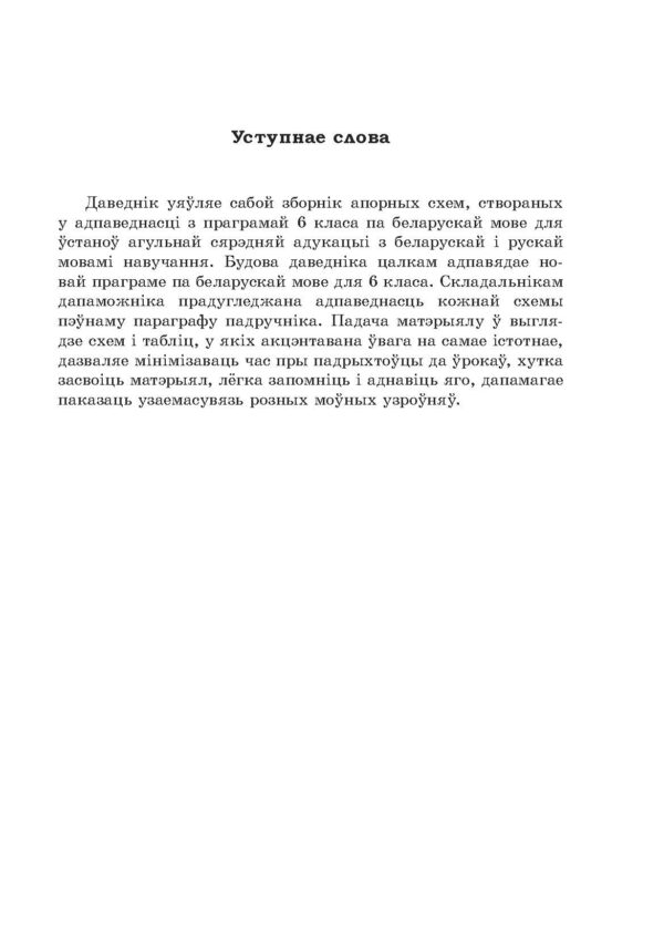 Даведнік змяшчае матэрыял па ўсіх тэмах курса беларускай мовы для 6 класа, складзены ў адпаведнасці з новымі правіламі беларускай арфаграфіі. Правілы пададзены ў выглядзе схем і табліц, што дазволіць структурыраваць матэрыял, зрабіць яго наглядным, палегчыць засваенне. Асаблівая ўвага надаецца фарміраванню моўнай і маўленчай дзейнасці вучняў, выпрацоўцы арфаграфічных і пунктуацыйных навыкаў.