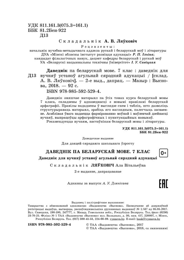 Даведнік змяшчае матэрыял па ўсіх тэмах курса беларускай мовы для 7 класа, складзены ў адпаведнасці з новымі правіламі беларускай арфаграфіі. Правілы пададзены ў выглядзе схем і табліц, што дазволіць структурыраваць матэрыял, зрабіць яго наглядным, палегчыць засваенне. Асаблівая ўвага надаецца фарміраванню моўнай і маўленчай дзейнасці вучняў, выпрацоўцы арфаграфічных і пунктуацыйных навыкаў. Рэкамендуецца вучням, настаўнікам беларускай мовы […]