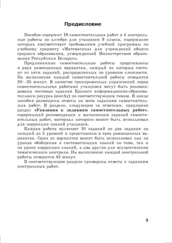 Пособие содержит 19 самостоятельных работ и 4 контрольные работы. Основной целью данного пособия является диагностика результатов обучения, выявление пробелов в знаниях, умениях и навыках по учебному предмету «Математика». Адресовано учителям математики, а также учащимся 9 классов учреждений общего среднего образования. Рекомендовано НМУ “Национальный институт образования Министерства образования Республики Беларусь”.