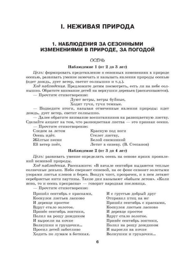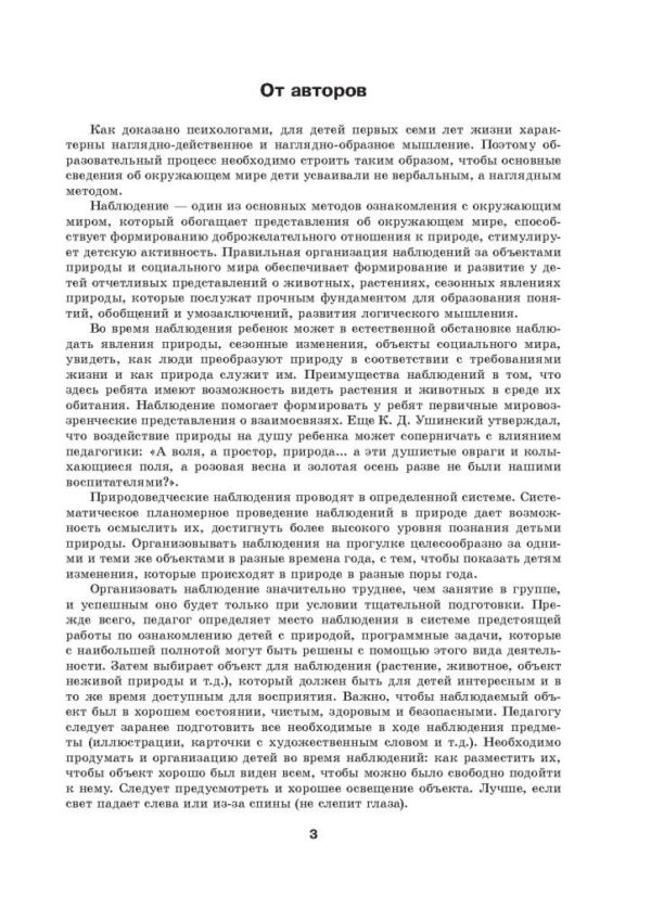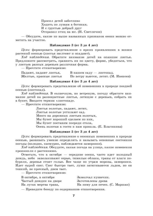 по возрастам условное, материал систематизирован по сезонам. Кроме того, в каждом наблюдении подобраны стихотворения, загадки, познавательный материал, которые облегчат педагогу работу по подбору информации.