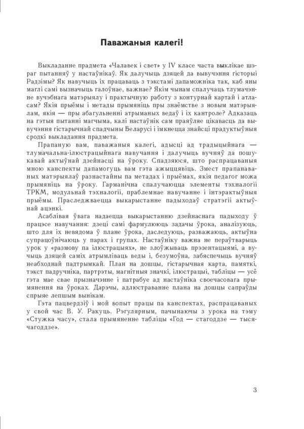 Змест тэматычных распрацовак урокаў адпавядае вучэбна-праграмнай дакументацыі: каляндарна-тэматычнаму планаванню, колькасці гадзін, паслядоўнасці вывучэння тэм, зместу дзеючага вучэбнага дапаможніка, вучэбна-метадычнаму забеспячэнню курса “Чалавек і свет. Мая Радзіма – Беларусь”, мэтам і задачам прадмета. Матэрыял дапаможніка змяшчае дадатковыя звесткі з гісторыка-біяграфічных крыніц. Выкарыстоўваецца дадатковая інфармацыя як для настаўніка, так і для вучняў. Адрасуецца настаўнікам пачатковых класаў.